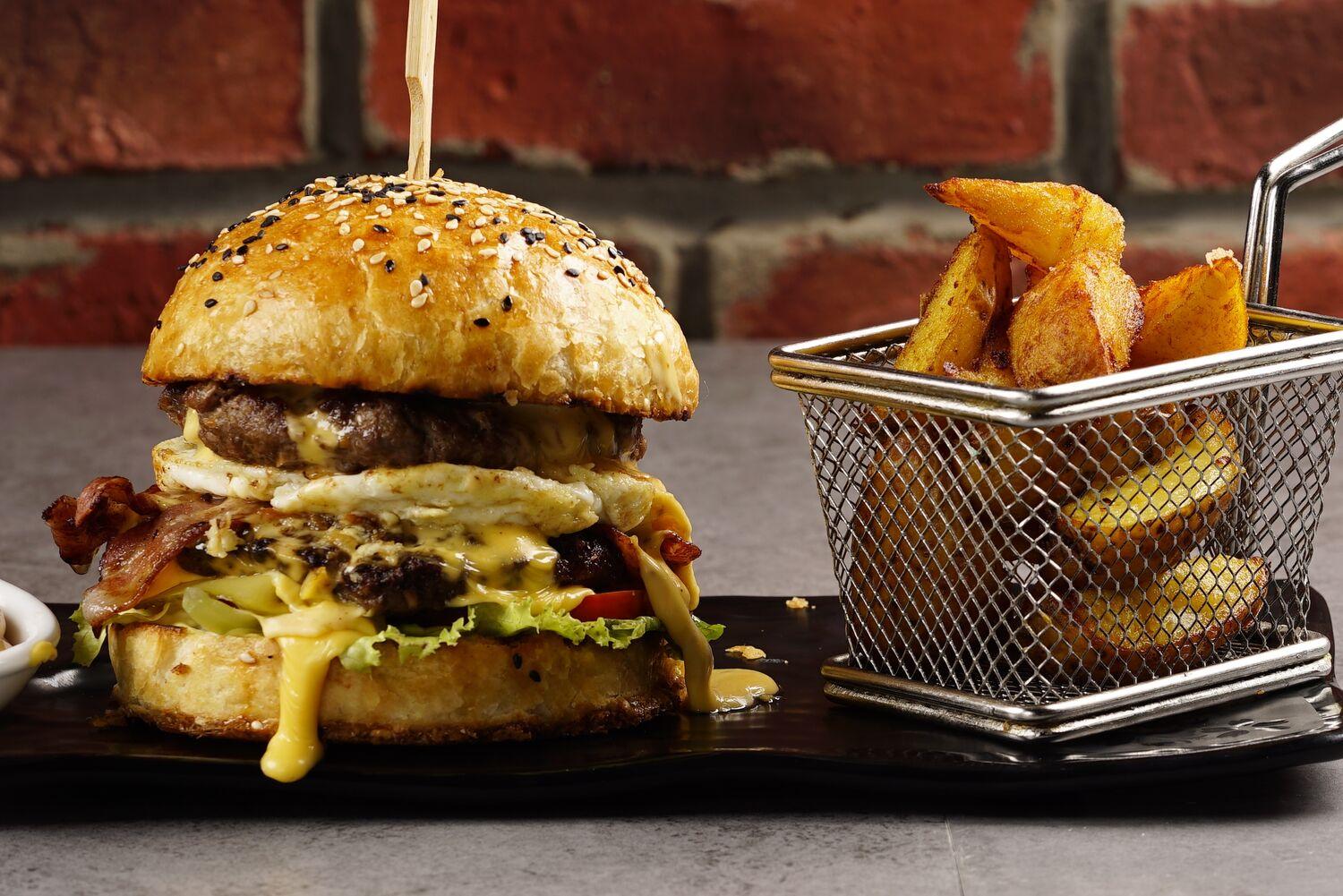Машиндсан үхрийн мах, шарсан өндөг, гахайн утсан мах, улаан лооль, өргөст хэмх, чеддар бяслаг, шарсан төмс, бургер талх