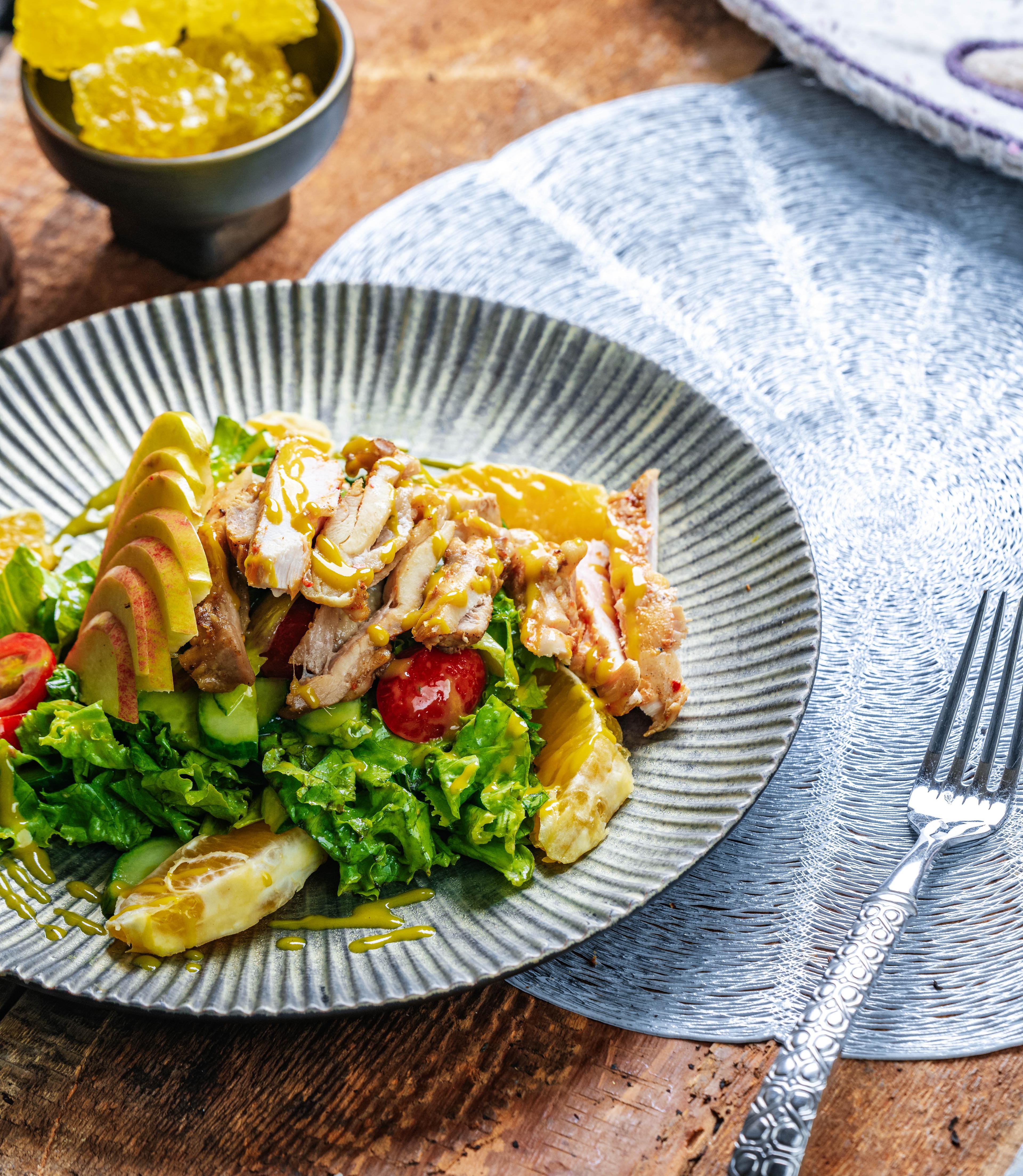 Тахианы гуяны мах, салатны навч, алим, жүрж, огурцы, помидор, хүрэн байцаа, давс, перец