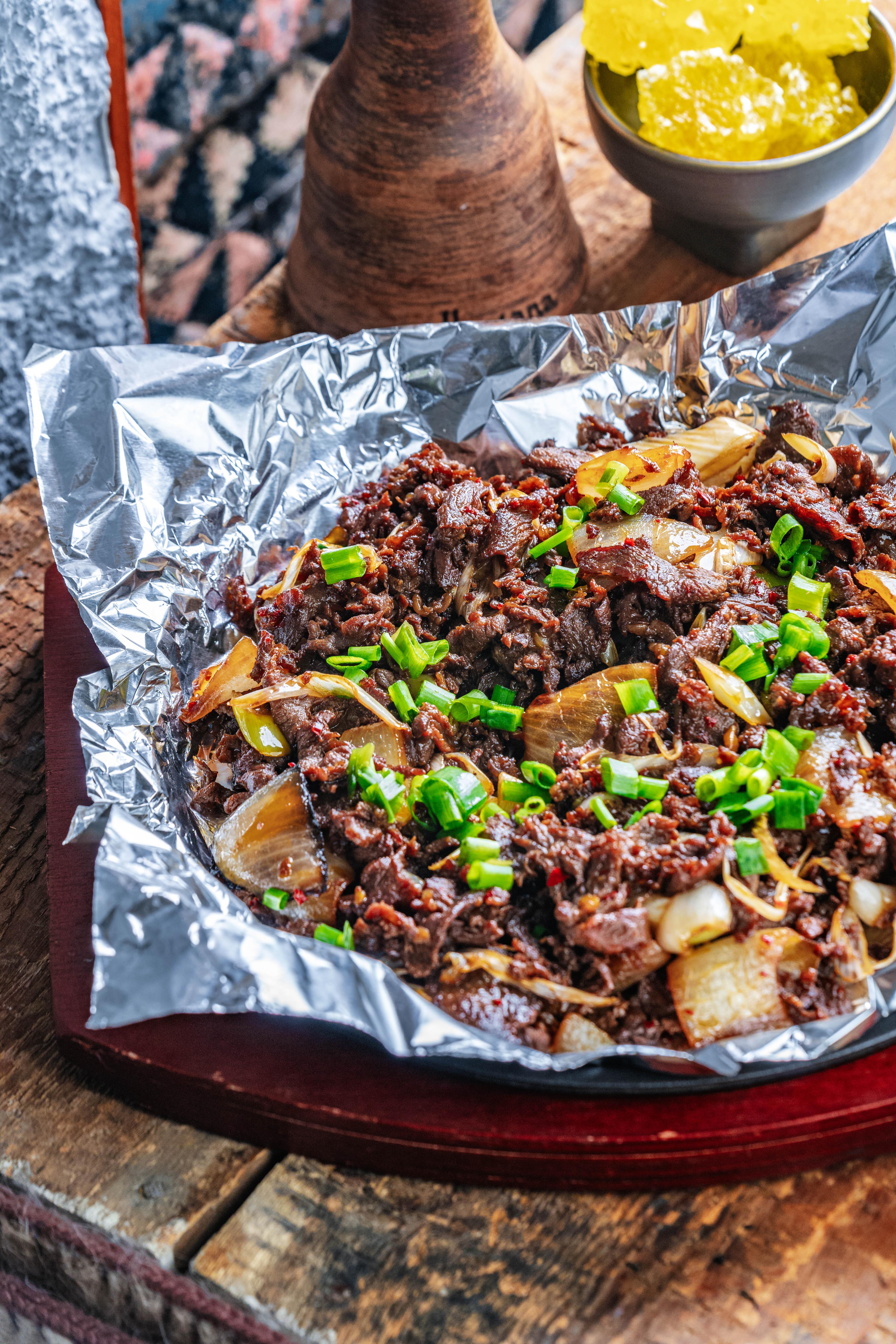 Үхрийн гуяны мах, сонгино, чинжүү, цагаан лууван, ногоон сонгино, сармис