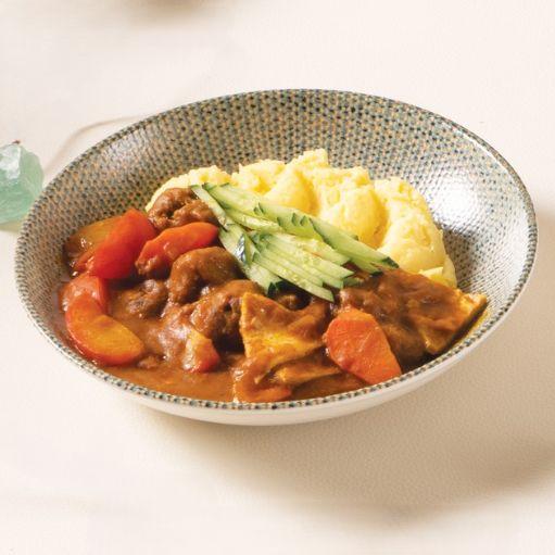 холимог будаа, шар буурцагны уураг, лууван, алим, улаан лооль, вегөн өндөг, паприка, гуляш соус, сонгино, шарсан хаш,