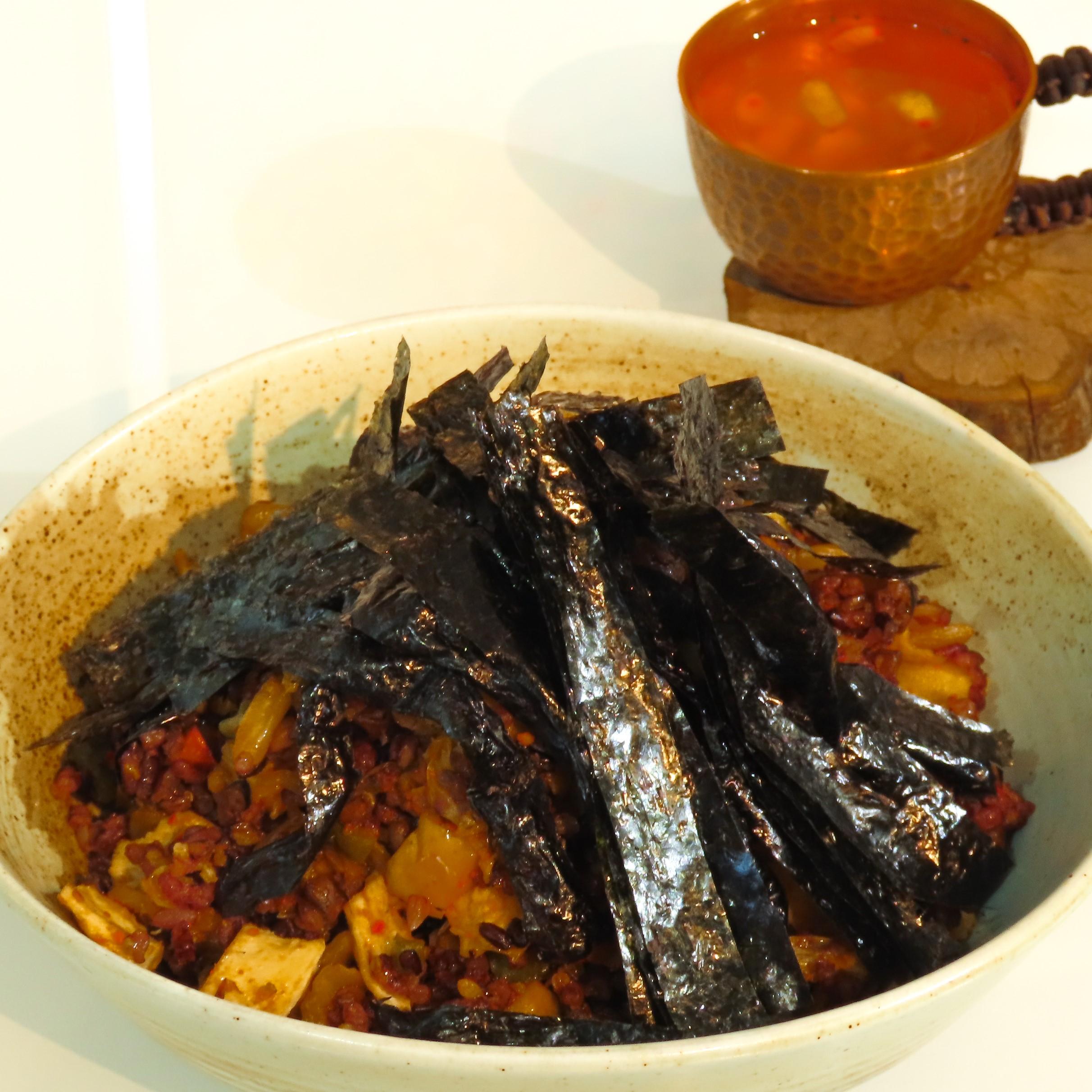 кимчи, холимог будаа, алим, улаан ногоон чинжүү, өндөг, далайн байцаа, соё соус, гүнжидийн тос